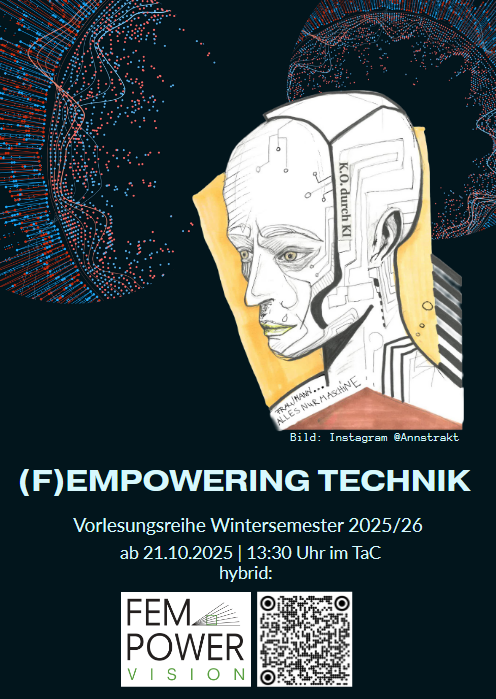 Diese Vorlesung ist im Modul (F)empowering Wissen verortet und verfolgt das Ziel, durch kritische Aufklärung und reflektierte Wissensvermittlung den Zugang zum Feld der Technik insbesondere für Frauen* zu erweitern und zu stärken. Sie unternimmt eine Reise von den Grundlagen feministischer Technikkritik hin zu vielfältigen Perspektiven auf den gegenwärtigen Einsatz von Künstlicher Intelligenz. In verschiedenen Vorträgen werden die komplexen Wechselverhältnisse zwischen Technik, Geschlecht, Macht und Wissen sowie deren Einfluss auf die heutige Arbeitswelt kritisch beleuchtet. Darüber hinaus werden Ansätze vorgestellt, wie mehr Frauen* für das Feld der Technik gewonnen werden können und welche Unterstützungsangebote den Studienerfolg nachhaltig sichern.